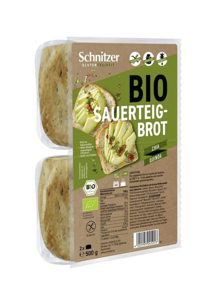 Овој премиум органски леб од чиа и киноа, без глутен, е богат со растителни влакна и полинезаситени масни киселини. Надополнет со семки од тиква, сусам и семки од сончоглед, ви обезбедува разновидност во чинијата и е совршен за вегетаријански појадок. Органски леб кој не само што е вистинско збогатување за вашата безглутенска диета, туку благодарение на неговата посебна содржина на хранливи материи ви ветува совршен почеток на денот.