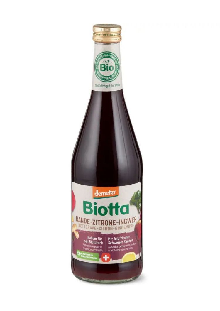 Свежото цвекло во комбинација со сокот од грозје, лимонот и освежителниот ѓумбир, создаваат хармонична мешавина на сокови со најдобар Demeter квалитет. Со 60% содржина на зеленчук и природен калиум од цвекло, оваа фина мешавина на органски сокови од Biotta е идеална како овошен извор на енергија за секој ден. Не само љубителите на цвекло ќе бидат воодушевени од оваа уникатна креација со сок. Органскиот сок од цвекло, лимон и ѓумбир е богат извор на калиум. Калиумот придонесува за нормално функционирање на крвниот притисок кога се пие една чаша (200 ml) од сокот.