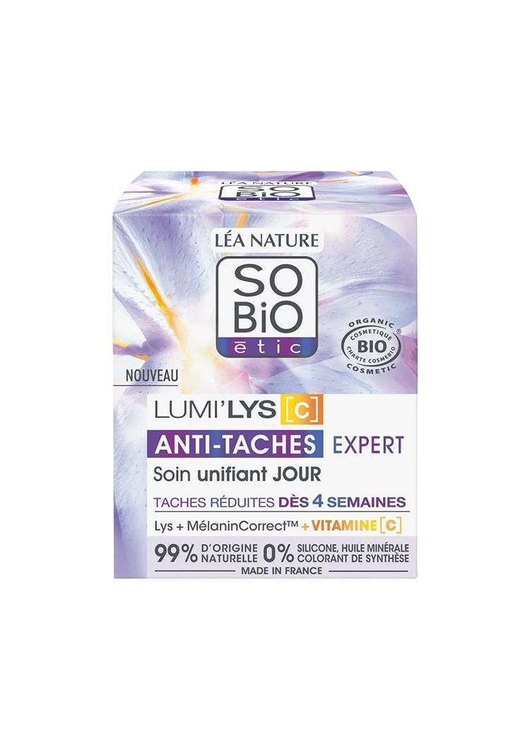 Формулиран за намалување на пигментните дамки (стареење, сонце, акни и мелазма) и за оживување на природниот сјај на тенот, оваа обединувачката дневна нега – против дамки – SO BIO étic ви нуди насочено дејство за кожа, без флеки.