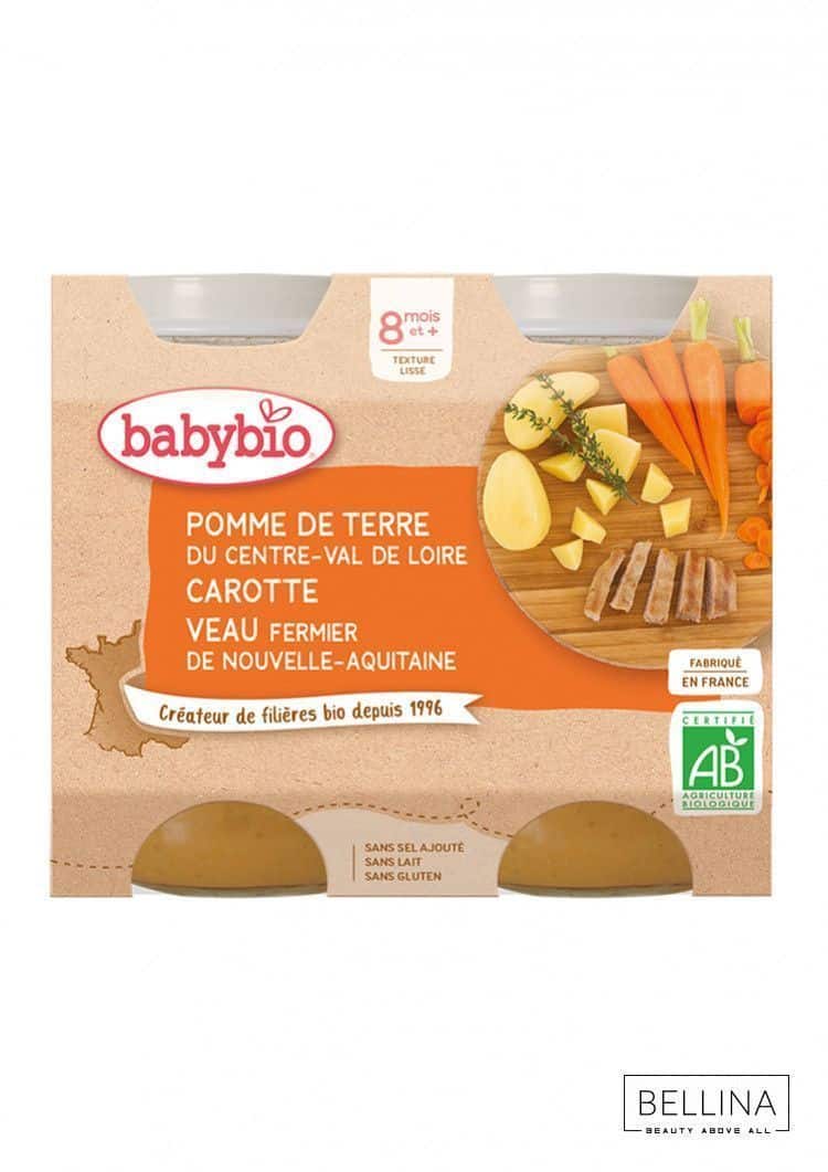Бидејќи бебињата го заслужуваат само најдоброто, Babybio им подготви јадење полно со нежности. Мешавина од зеленчук: компири од Centre-Val de Loire, моркови, кромид, домати и мајчина душица од нашите региони, „champignons de Paris“ со телешко месо од слободната палета на Nouvelle-Aquitaine.