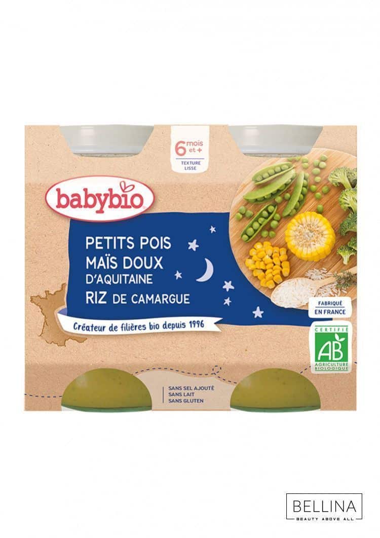 Babybio ноќната каша од грашок, пченка и ориз за 6+ месеци е каша со мазна текстура направено од француски грашок и кромид, слатка пченка од Аквитанија и ориз од Camargue.