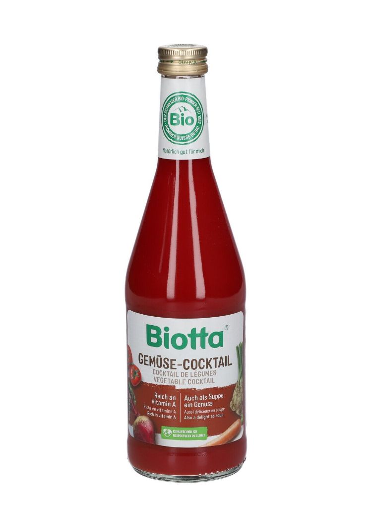 Коктелот од зеленчук од Biotta е вкусна мешавина од различен органски зеленчук, збогатен со малку морска сол. Може да се користи на различни начини. Изненадува како совршен придружник на аперитив или како топла супа. Овој сок е богат со витамин А (од бета-каротин). Витаминот А придонесува за одржување на нормален вид.