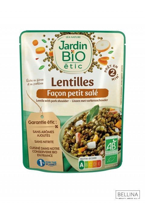 Jardin BiO étic ви нуди оригинални органски инстант оброци кои се готови за само неколку минути. Со овој рецепт Ве каниме на гурманско патување низ локалните регионални вкусови претставувајќи ви вкусна мешавина од зелена леќа комбинирана со мали кромитчиња, моркови, билки и парчиња шунка. Конзумирајте по ваша желба, како главно јадење или како прилог. Уживајте во вашата храна!