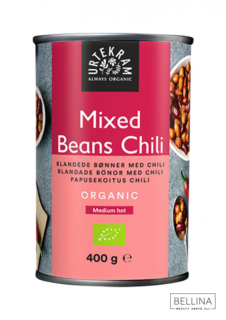 URTEKRAM Mixed Chili Beans е комбинација од наут, црвен грав и канелини грав во зачинет и вкусен сос со вкус на луто чили. Користете го за подготовка на Чили син карне, како основа во прелив за салата или во тестенини. Подготвен e за употреба, може да се јаде ладен или загрејте го на неколку минути.