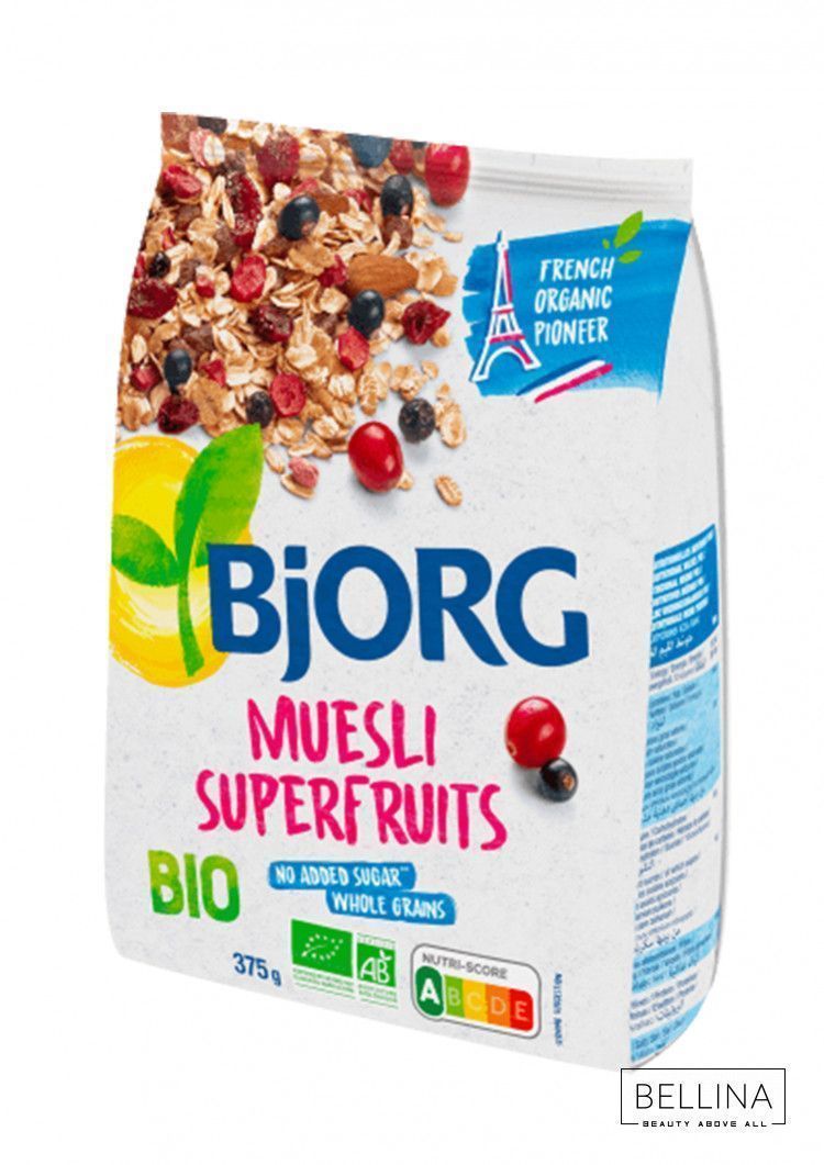 Откријте ги нашите вкусни мусли Bjorg Superfruit. Тие му ги даваат на вашето тело потребните влакна за да го започне денот како што треба. Нејзината вкусна мешавина на суперовошје без додаден шеќер** се состои од грозје, црни рибизли, боровинки и брусница. Внесува овошен допир на вашиот појадок за пријатно будење.